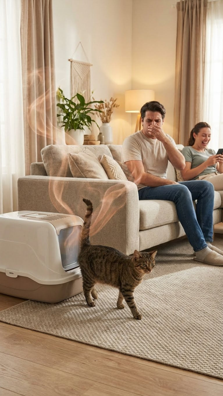 The solutions you’re using (premium litter, scented candles, sprays…) only cover the odor — they don’t stop ammonia.